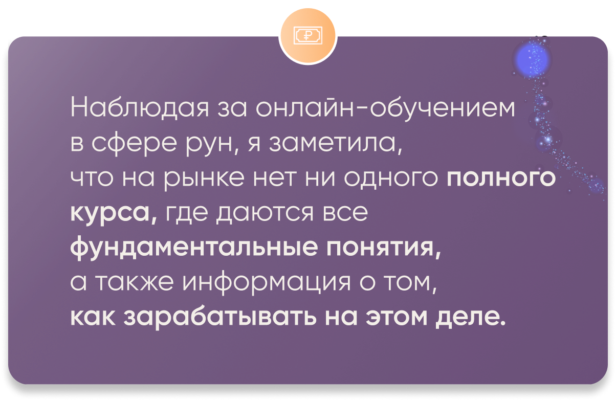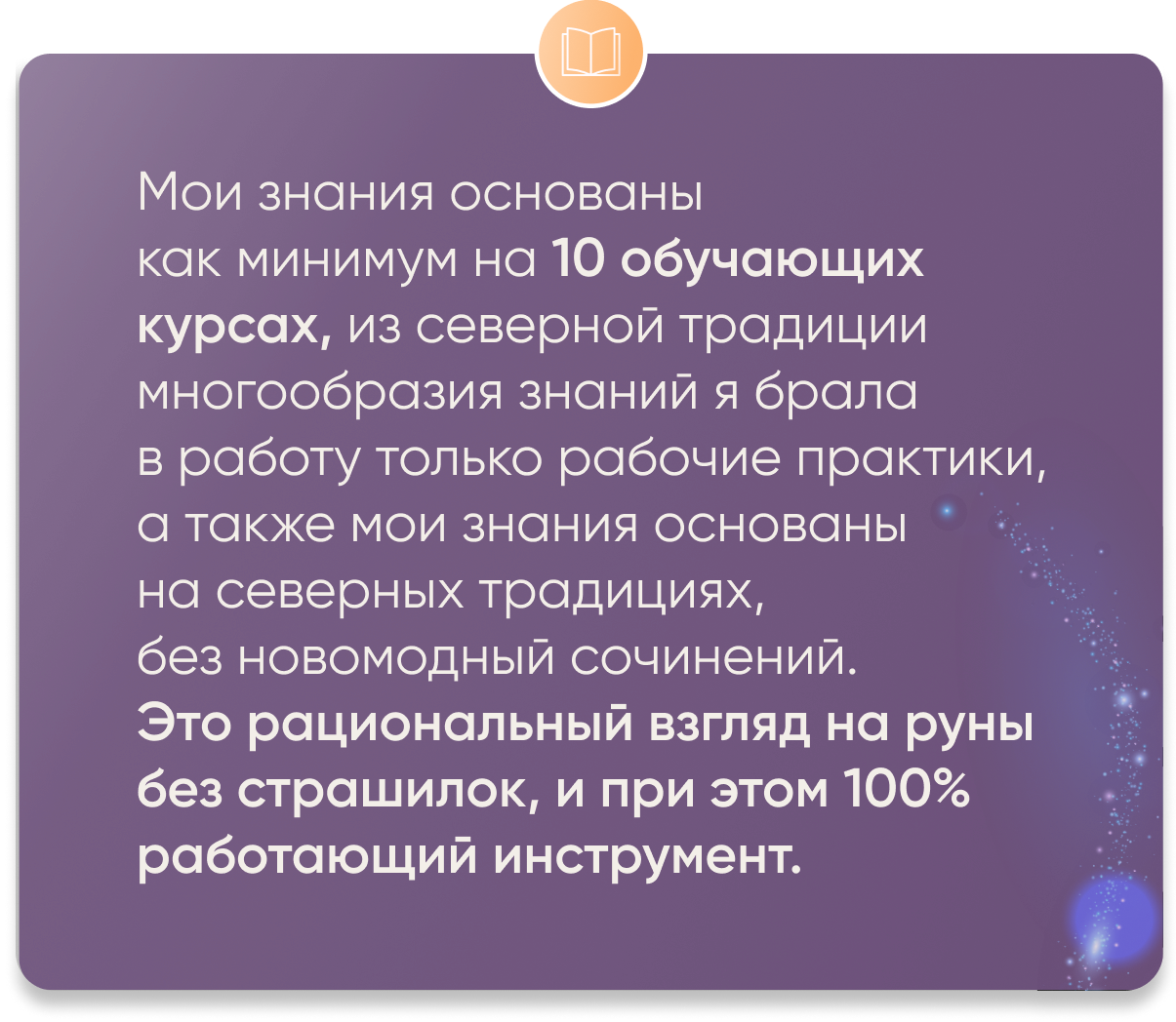 Сейчас эзотерика набирает обороты, и чтобы стать успешным рунологом, надо владеть 100% рабочими техниками, это я и даю на курсе.